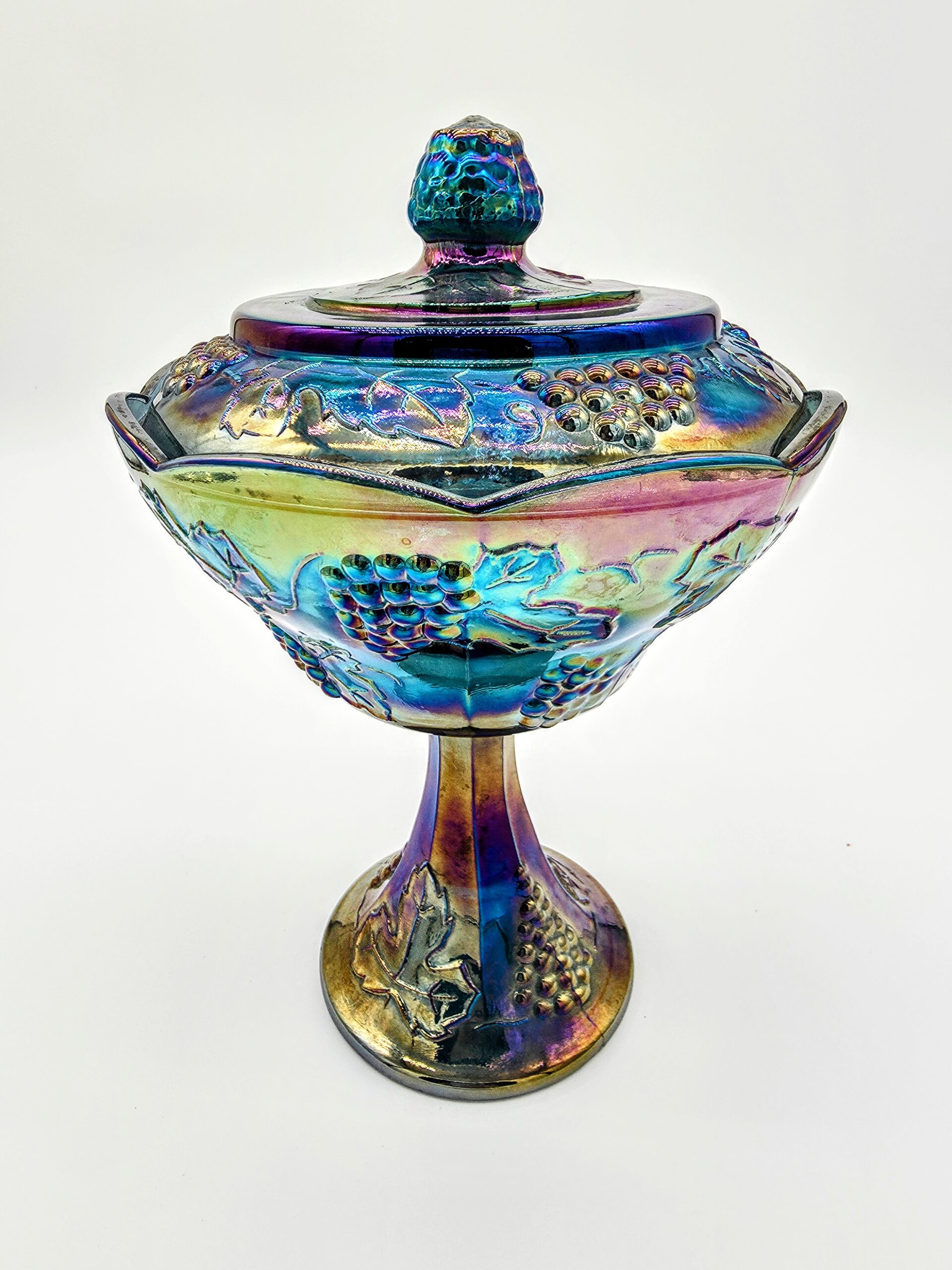 Featuring a sturdy pedestal base and fitted lid with a grape cluster finial, this piece is both decorative and functional — perfect for storing sweets, jewelry, or simply catching the light as a display piece. Originally made in the mid-century revival of carnival glass, it reflects the joyful opulence and accessible luxury that defined its era.