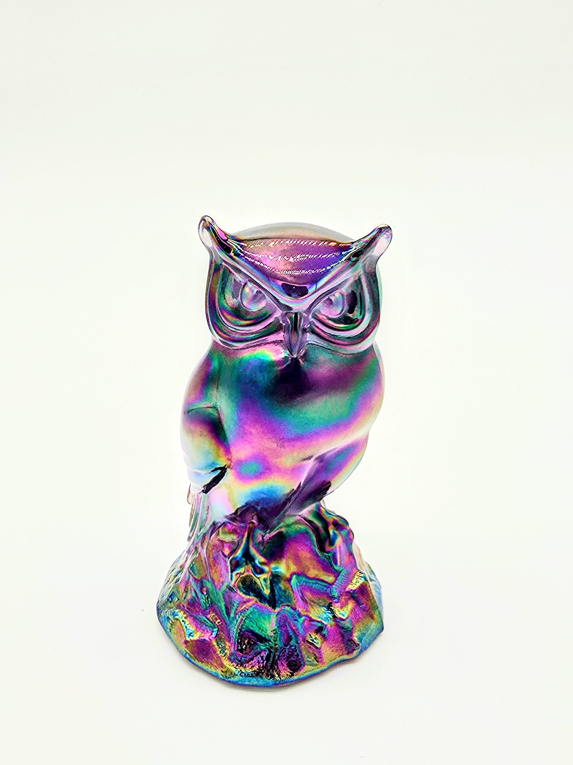 A mesmerizing iridescent owl figurine crafted in carnival glass — radiant in every light, collectible, and full of charm.