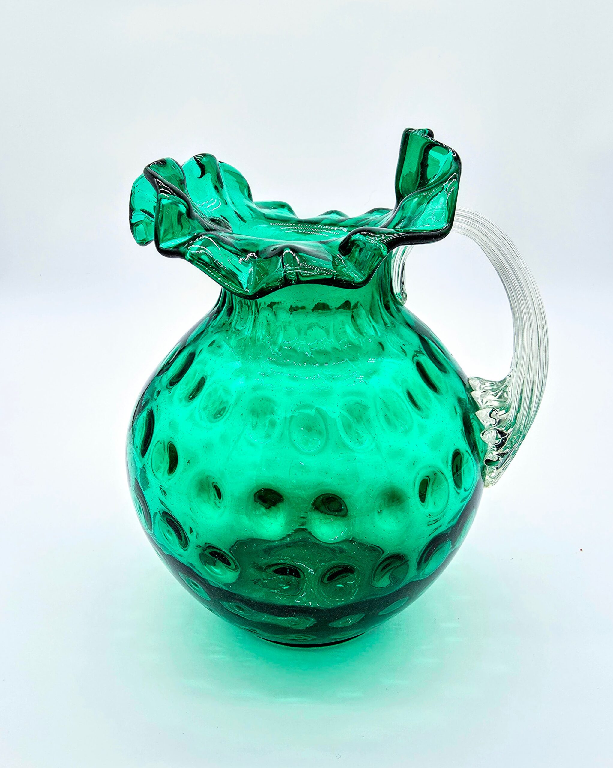 A striking green Fenton hobnail glass pitcher featuring a clear ribbed handle and ruffled rim — a timeless collectible with vintage charm.