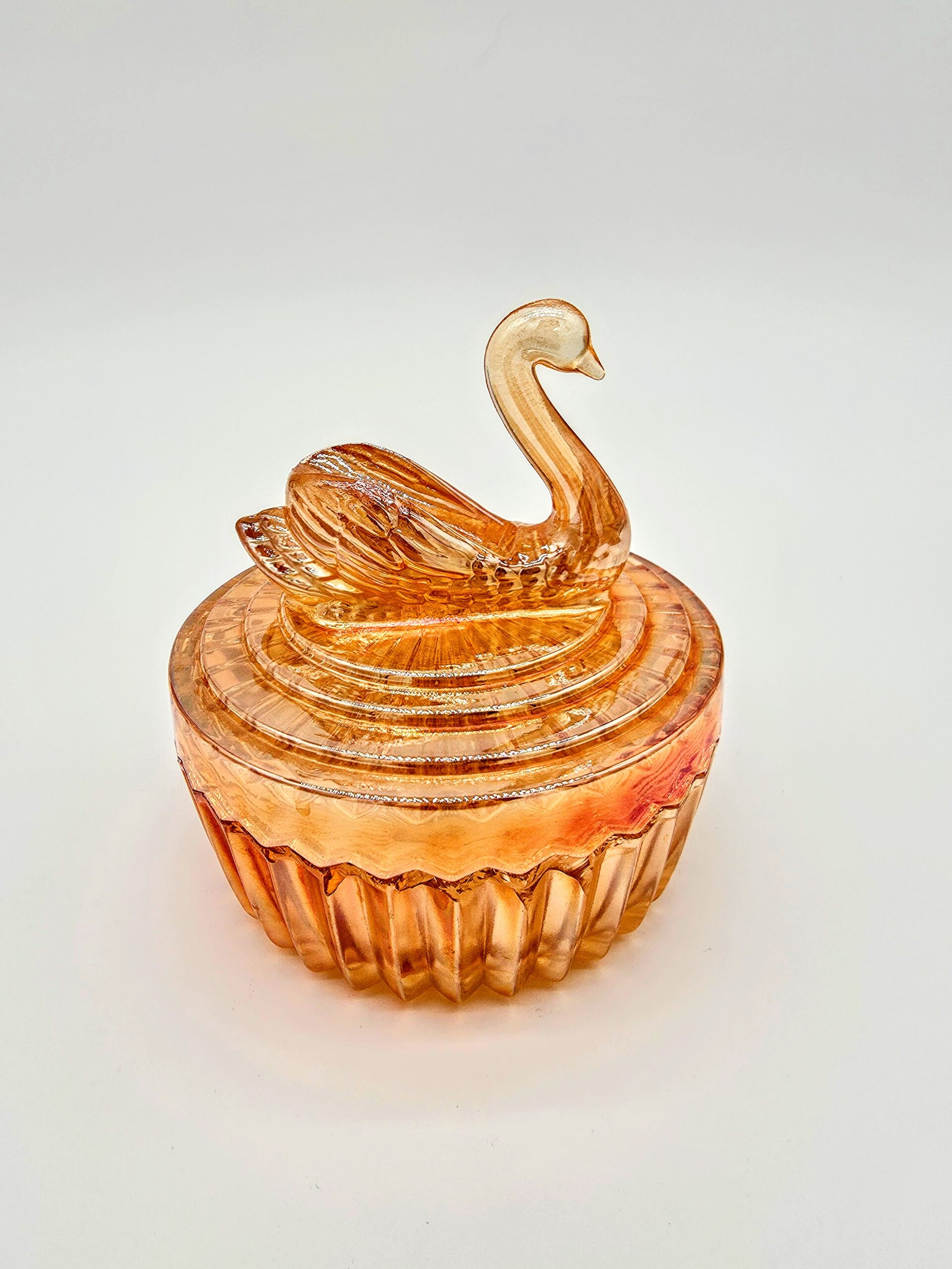 Elegant orange pressed glass candy dish featuring a swan-shaped lid — a graceful blend of vintage charm and collectible artistry.