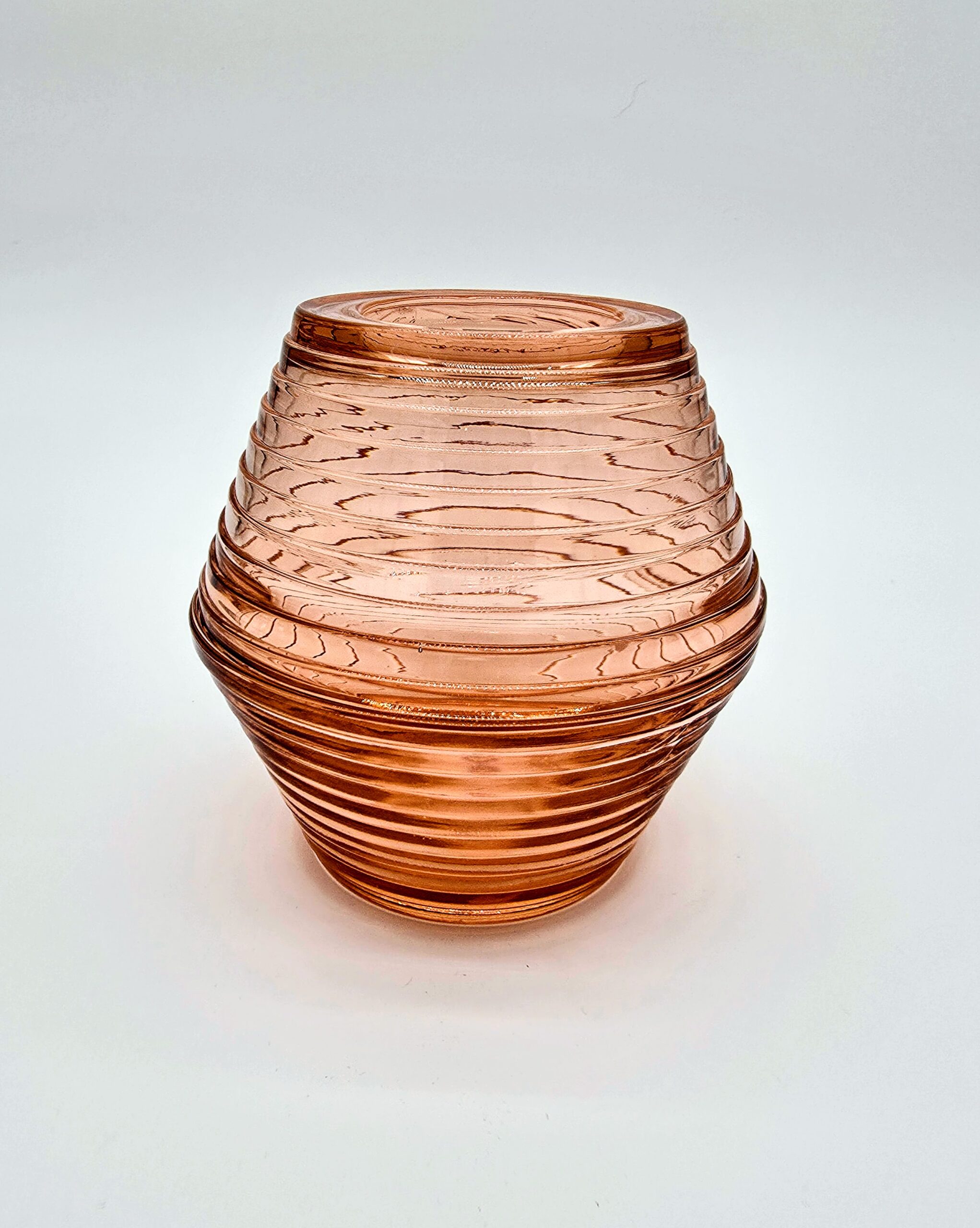 This Vintage Pink Fairy Light is a graceful example of mid-century glass design, featuring a ribbed exterior and soft rose hue that radiates gentle warmth when illuminated. The subtle concentric pattern enhances the way light dances across the surface, creating a serene and timeless effect.