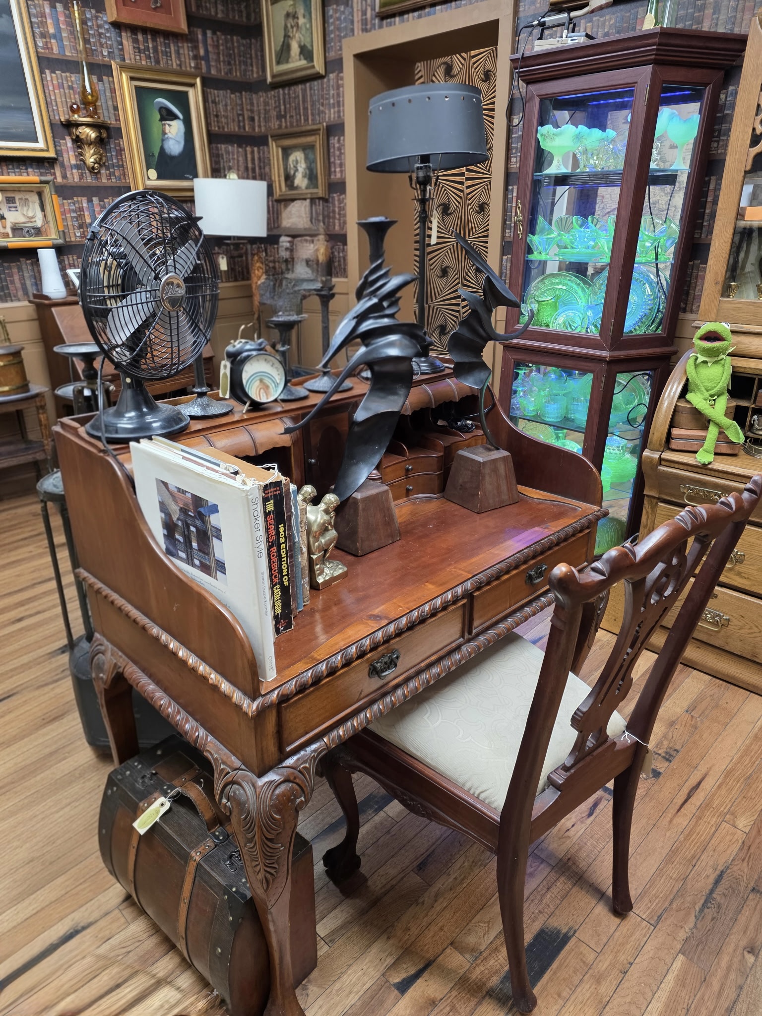 October 10, 2025This Queen Anne Revival Writing Desk and Chair Set embodies the elegance of traditional craftsmanship. The desk features a rope-edged border, hand-carved cabriole legs, and two slim drawers with vintage hardware. Its rich wood tone and graceful curves evoke classic 18th-century English design while offering modern functionality in a compact form.